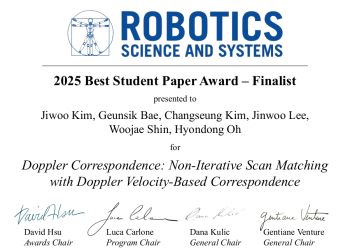 Among 163 accepted papers at RSS 2025, Jiwoo Kim and Geunsik Bae’s paper "Doppler Correspondence: Non-Iterative Scan Matching with Doppler Velocity-Based Correspondence" was selected as one of the three Best Student Paper Award Finalists.