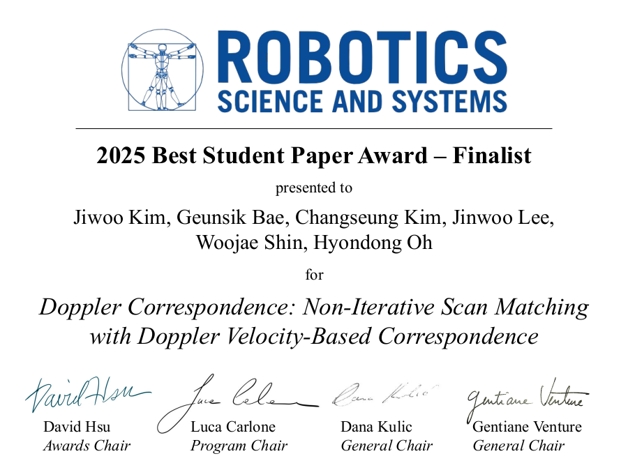 Among 163 accepted papers at RSS 2025, Jiwoo Kim and Geunsik Bae’s paper "Doppler Correspondence: Non-Iterative Scan Matching with Doppler Velocity-Based Correspondence" was selected as one of the three Best Student Paper Award Finalists.